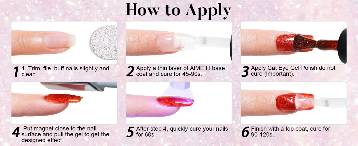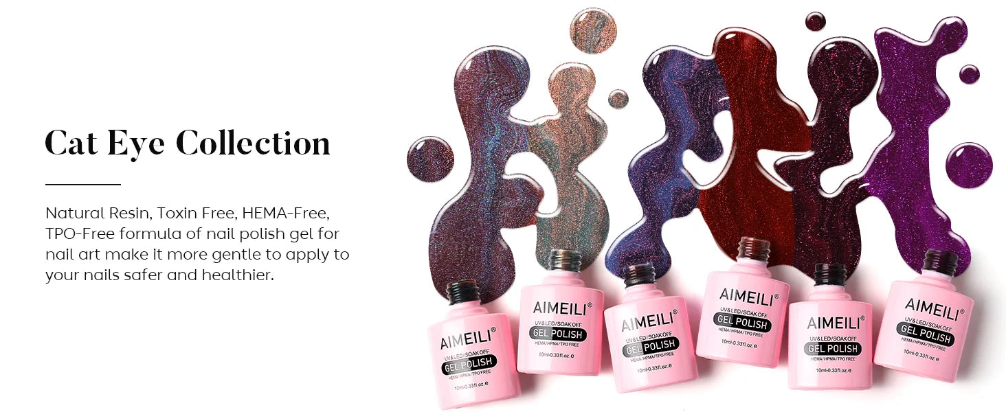 AIMEILI Cat Eye Gel Nail Polish Set includes 6 magnetic gel colors with smooth application and long-lasting glossy finish. HEMA-Free, vegan and cruelty-free formula suitable for salon and DIY nail art.